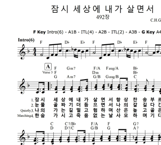 잠시 세상에 내가 살면서 (찬송가 492장),알토,테너,화음,악보,가사,쉐키나,F-G
